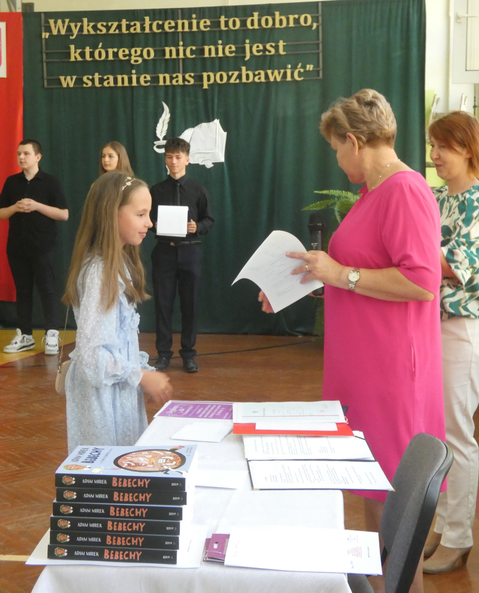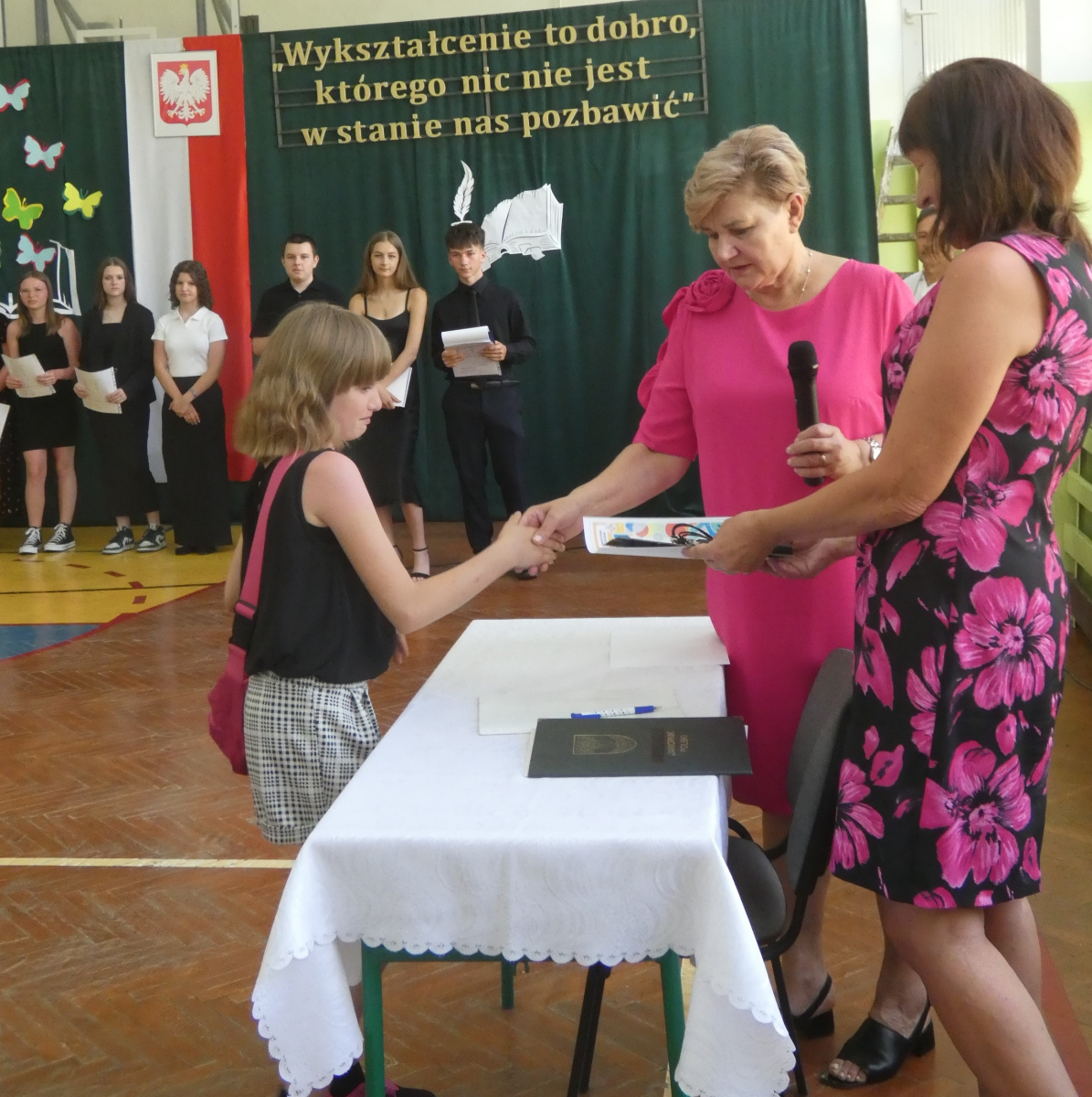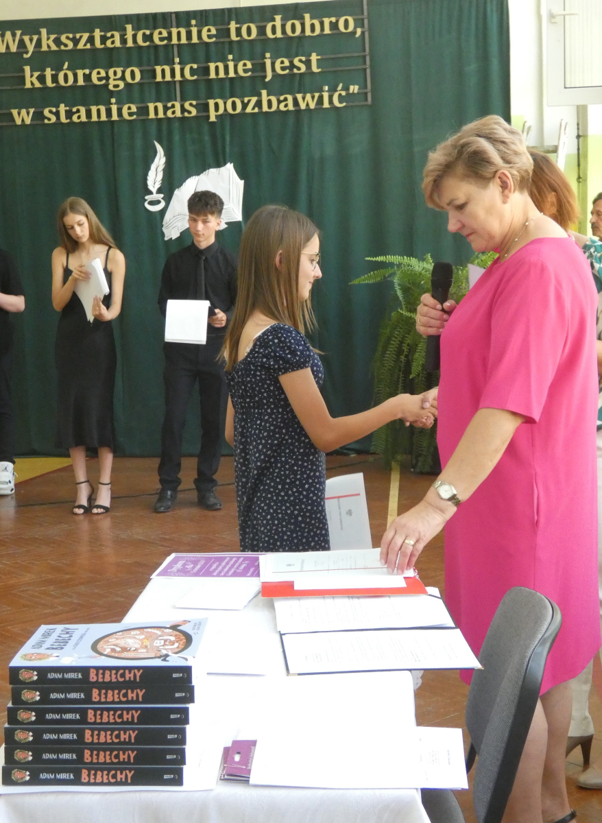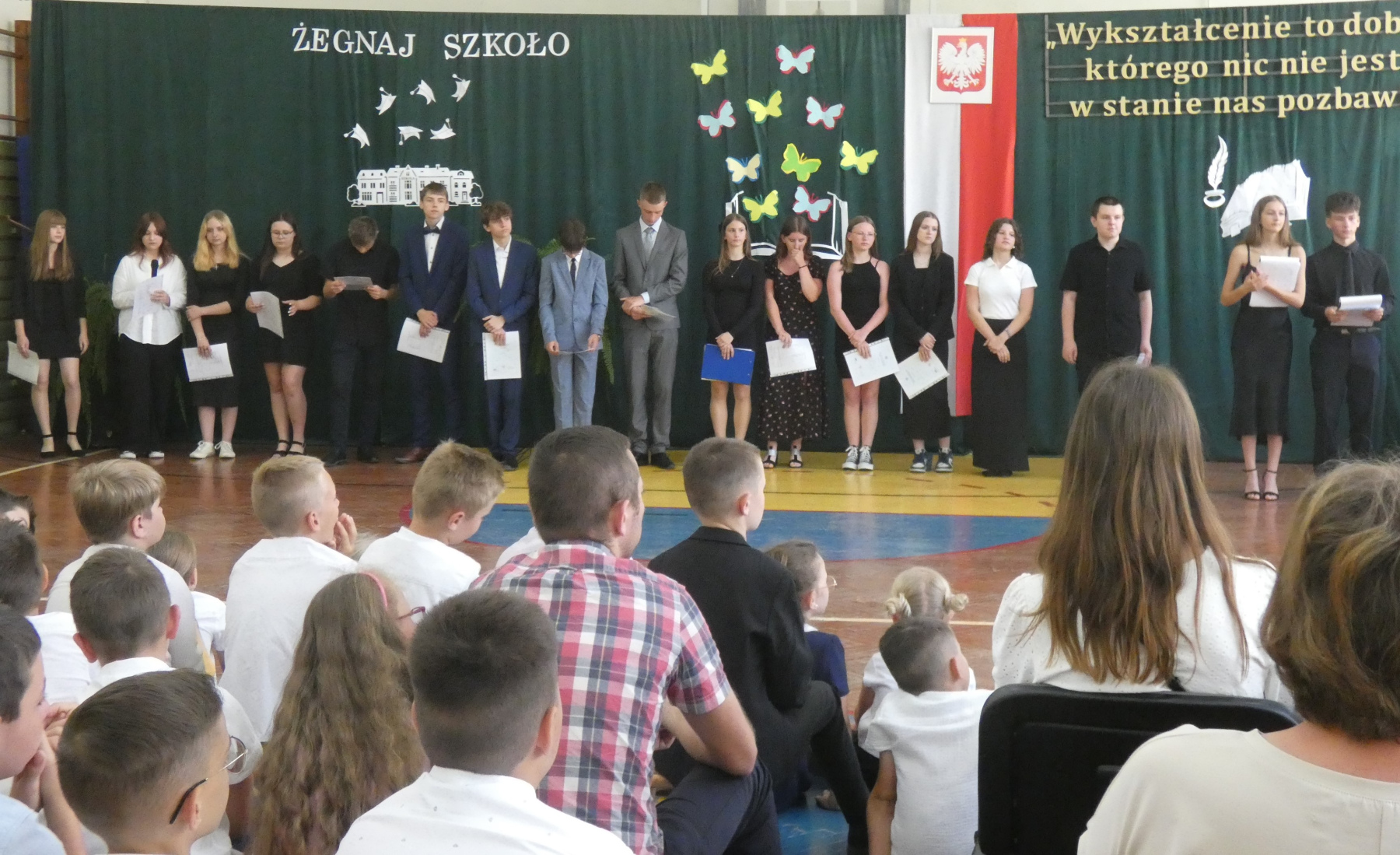 W końcu nadszedł tak bardzo wyczekiwany przez wszystkich uczniów ostatni dzień szkoły. 21.06.2024 r. odbyło się uroczyste zakończenie roku szkolnego 2023/2024. Dyrektor szkoły pani Romana Dubas podsumowała osiągniecia dydaktyczno-wychowawcze oraz wręczyła nagrody uczniom, którzy uzyskali świadectwo z wyróżnieniem, wykazali się w konkursach, zawodach czy pracy na rzecz szkoły.