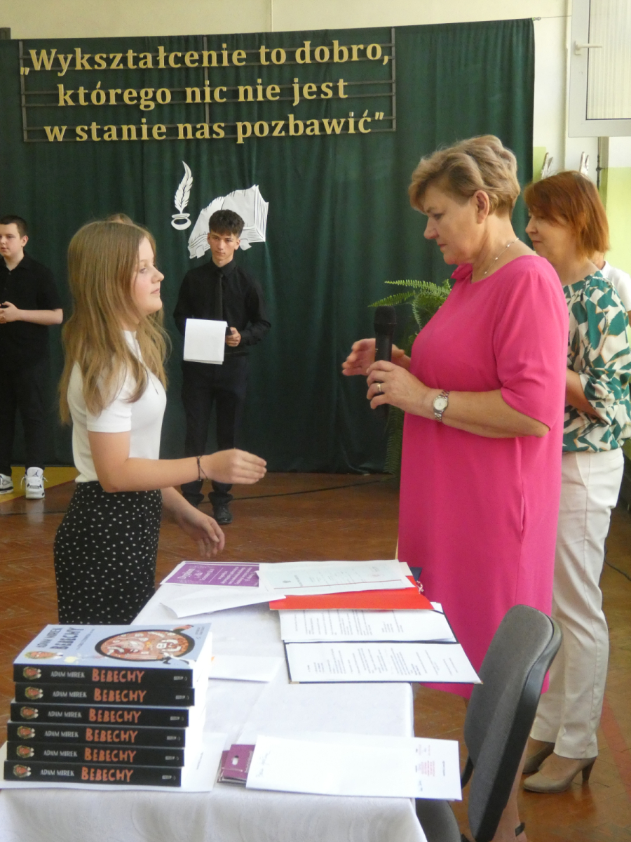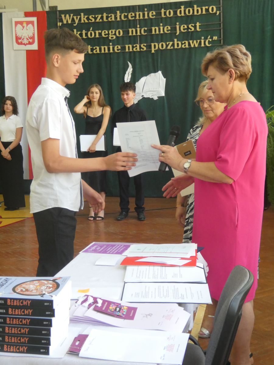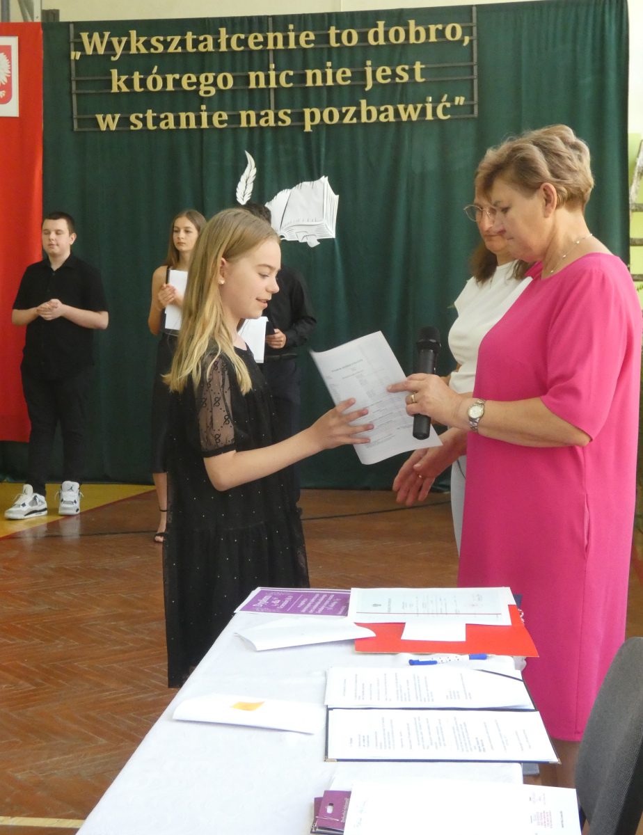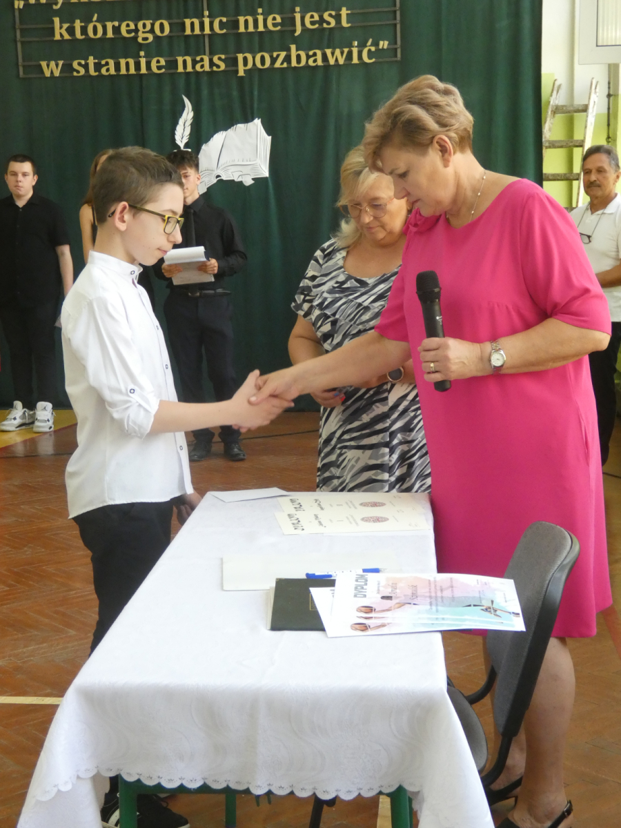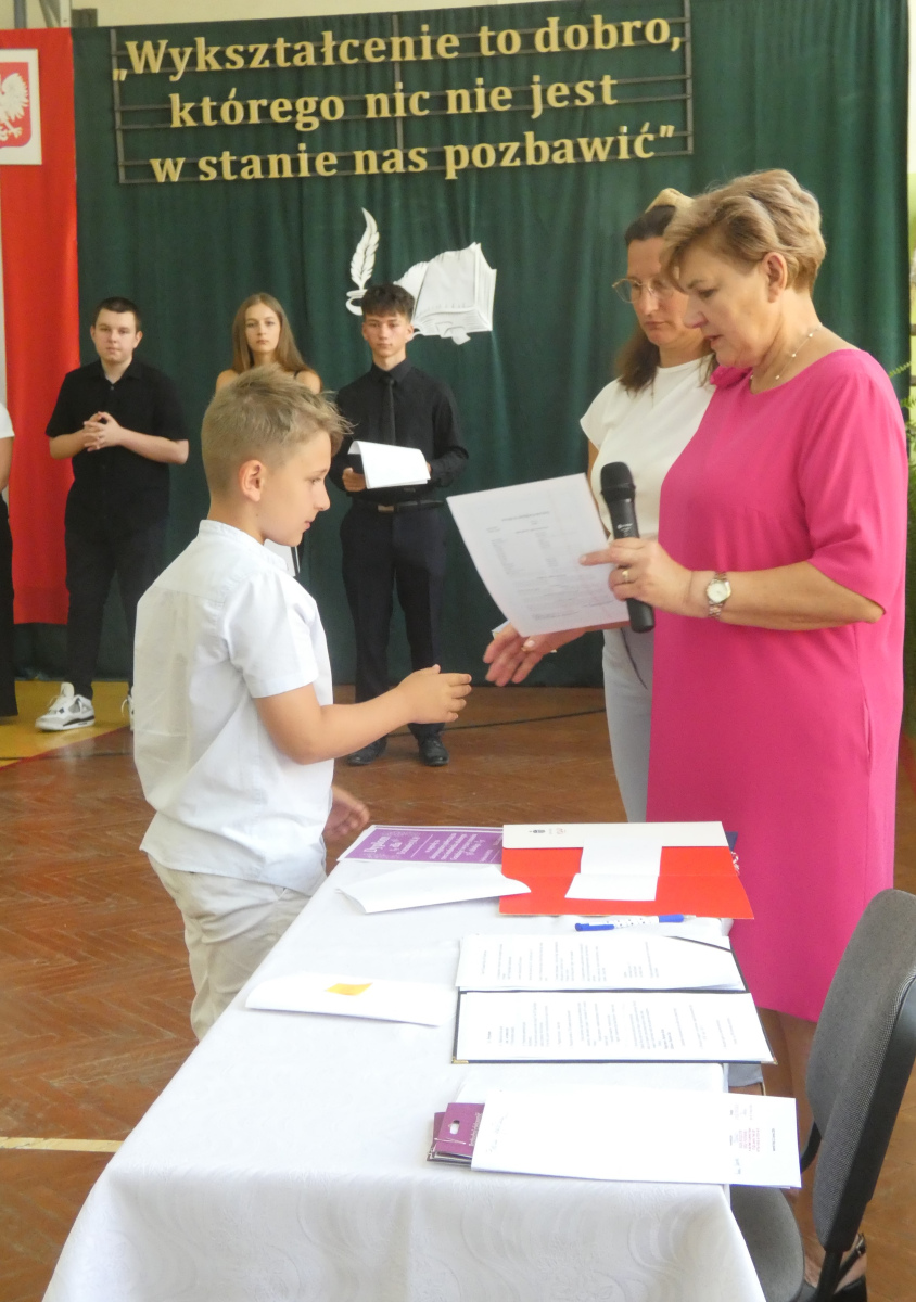 W końcu nadszedł tak bardzo wyczekiwany przez wszystkich uczniów ostatni dzień szkoły. 21.06.2024 r. odbyło się uroczyste zakończenie roku szkolnego 2023/2024. Dyrektor szkoły pani Romana Dubas podsumowała osiągniecia dydaktyczno-wychowawcze oraz wręczyła nagrody uczniom, którzy uzyskali świadectwo z wyróżnieniem, wykazali się w konkursach, zawodach czy pracy na rzecz szkoły.