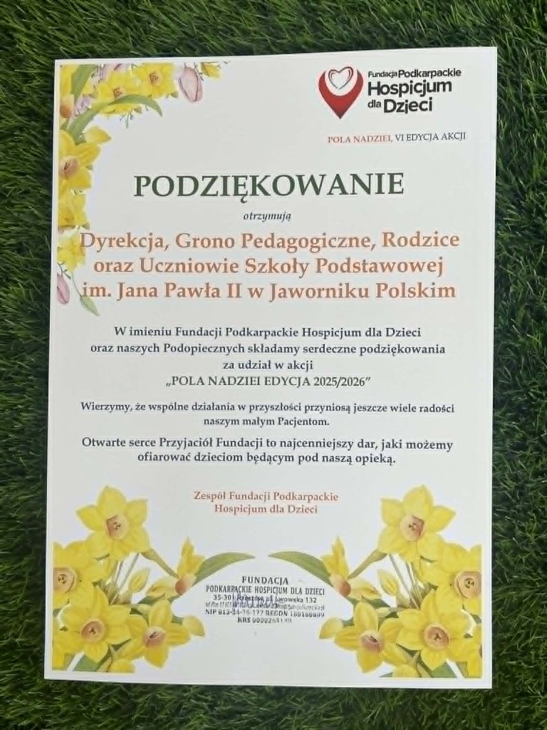 Nasza szkoła w akcji „Pola Nadziei” – Wiosna 2026 Z radością informujemy, że nasza szkoła włączyła się w VI edycję akcji „Pola Nadziei”, organizowanej na rzecz Podopiecznych Fundacji Podkarpackie Hospicjum dla Dzieci To wyjątkowa inicjatywa, która nie tylko wspiera potrzebujące dzieci, ale także uczy naszych uczniów empatii, wrażliwości i pomagania innym. Żonkil – […]